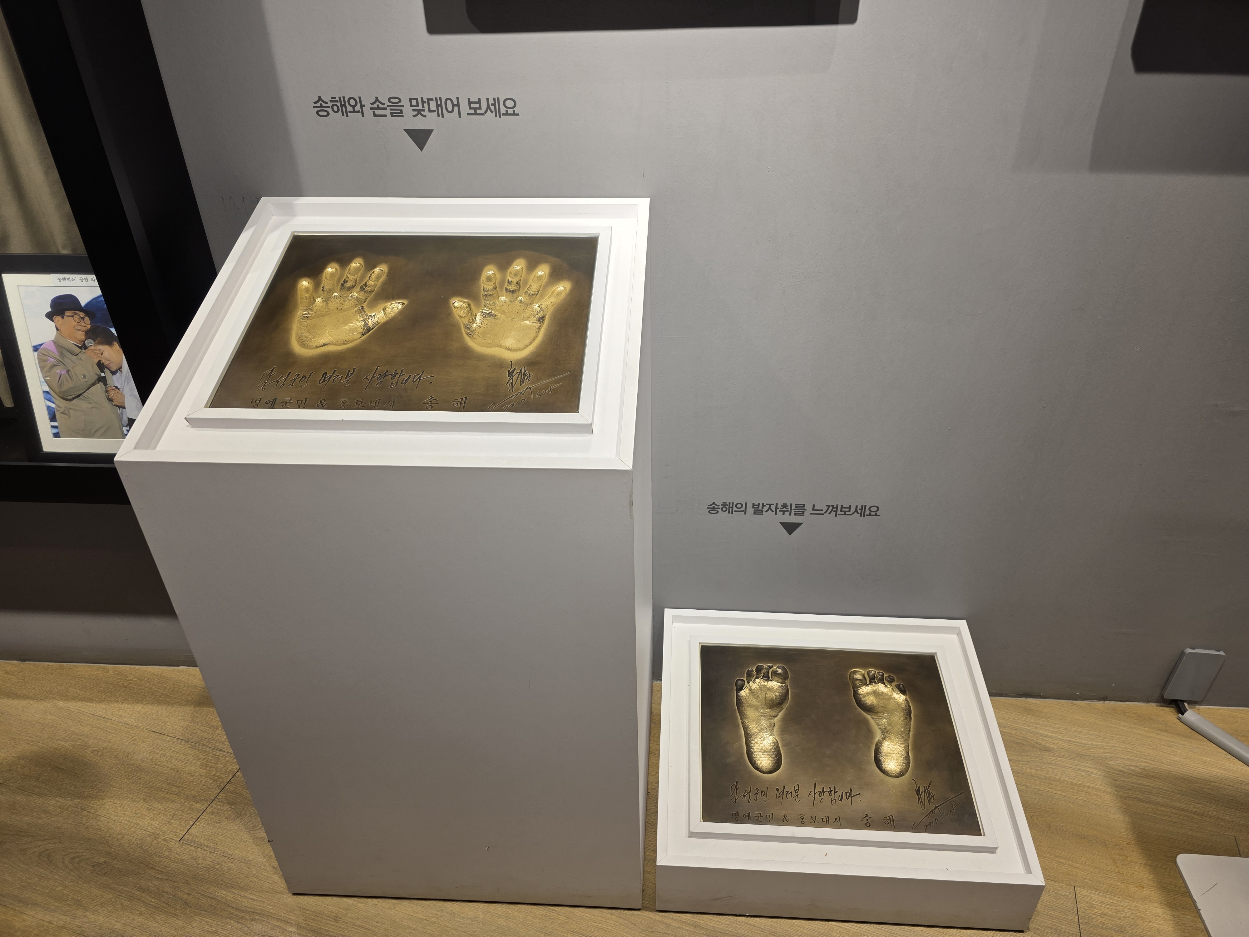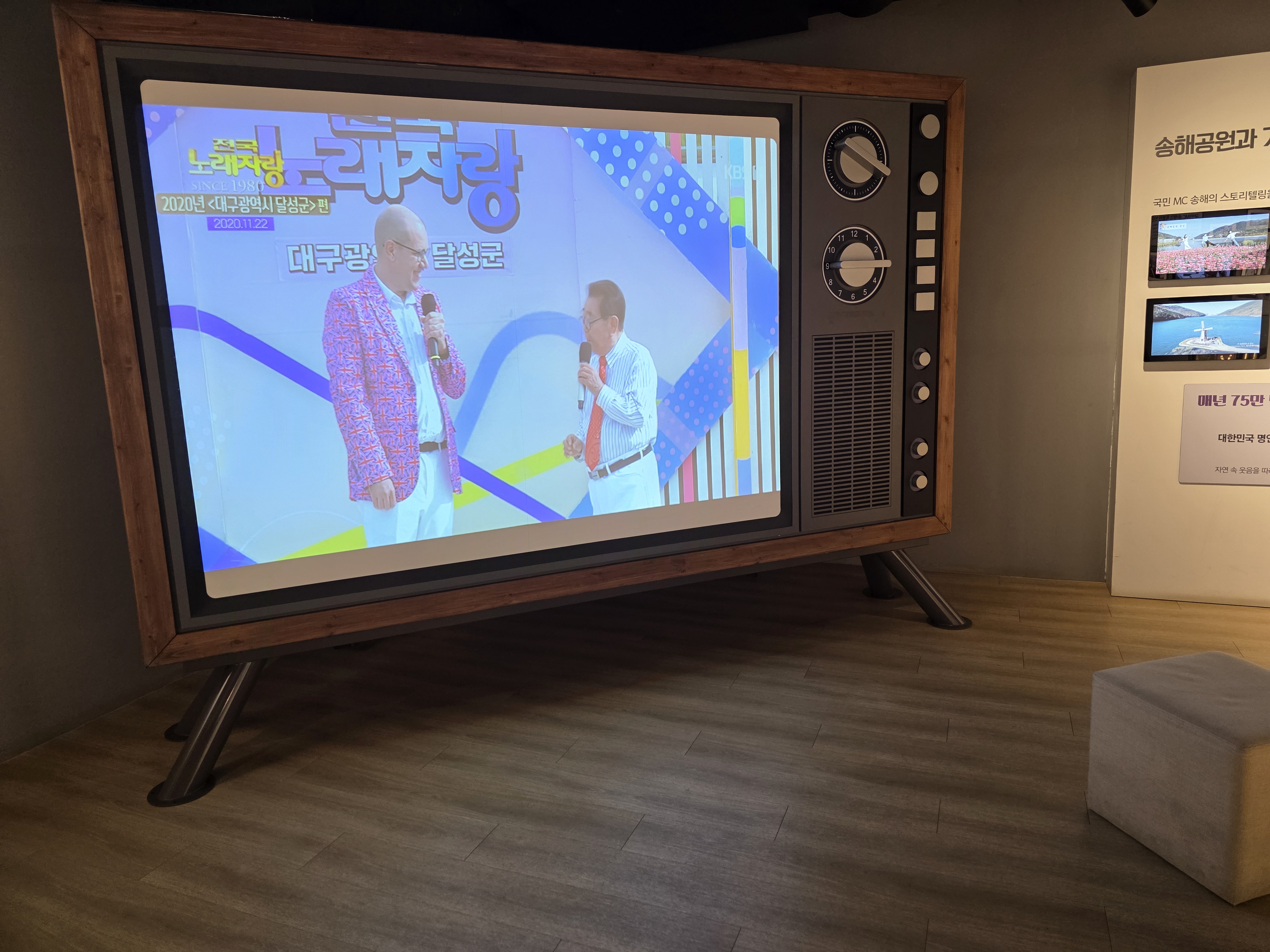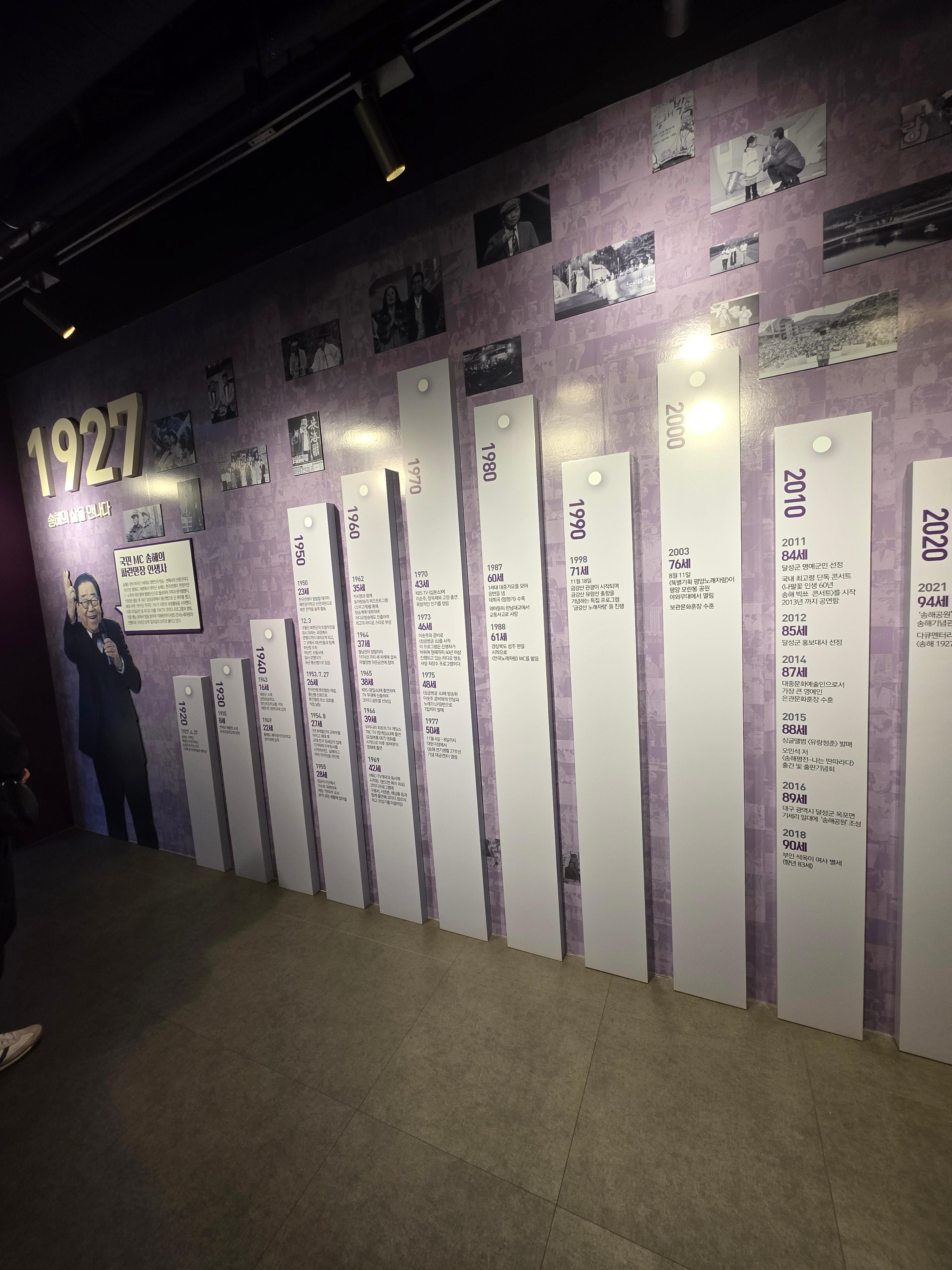 - 1층에는 송해 선생님의 생애 연표, 방송 활동 사진, 영상 기록이 전시되어 있어요.